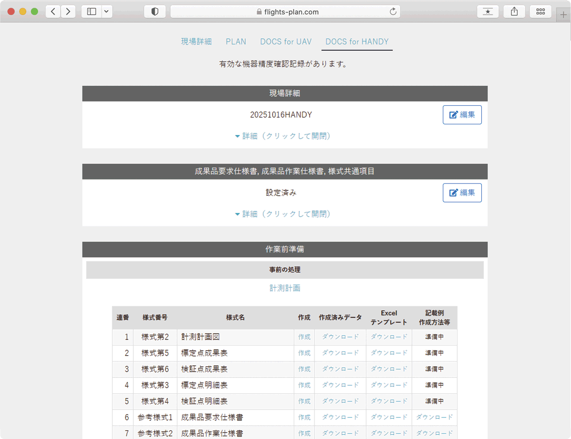 ハンドヘルド型レーザースキャナー(FLIGHTS SCAN HANDY等)と連携し、公共測量およびi-Constructionに必要な帳票・成果品を自動作成し、制度への準拠と業務効率化を支援するWebサービスです。